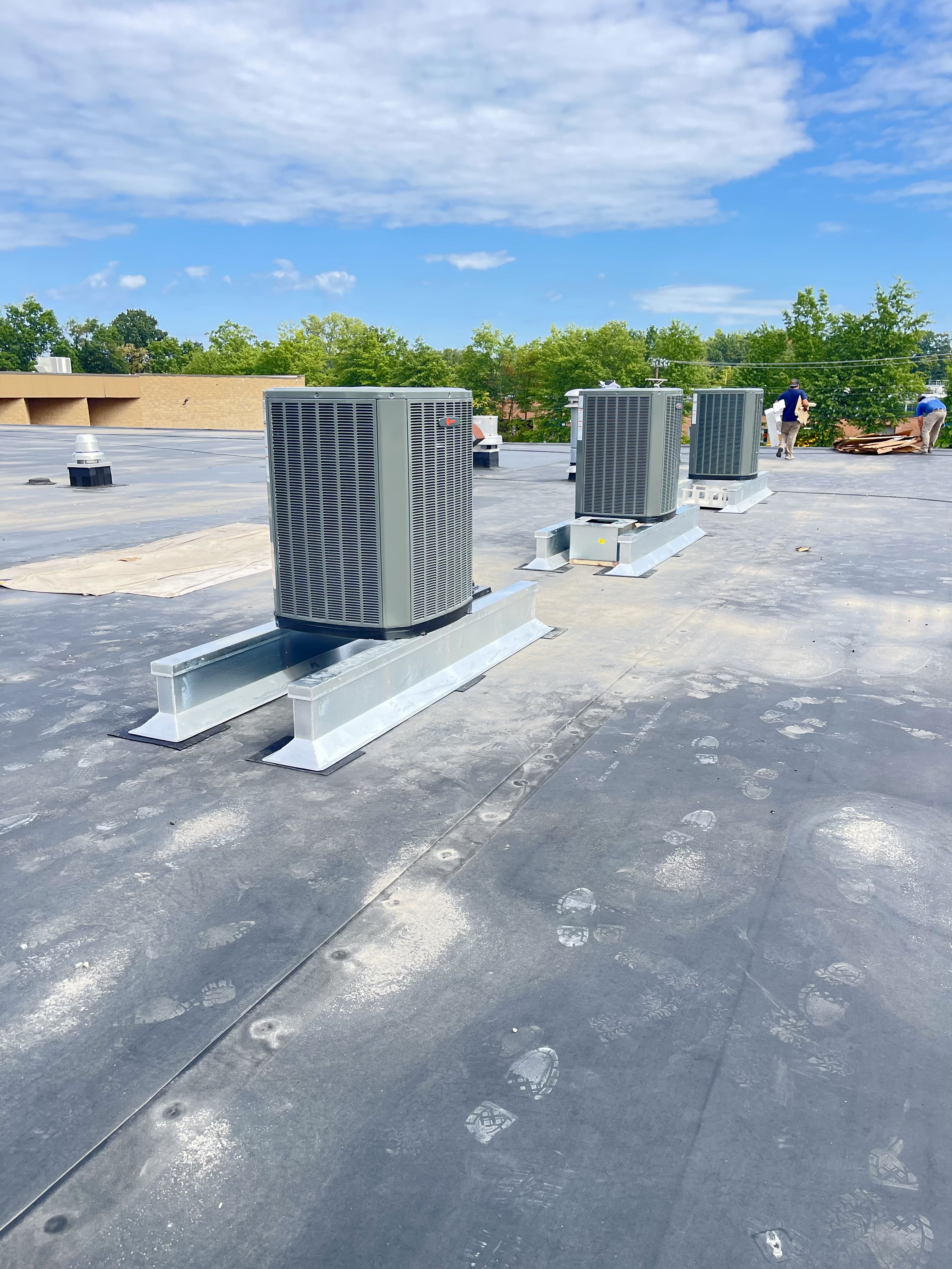 Commercial rooftop HVAC with proper mounting and electrical.